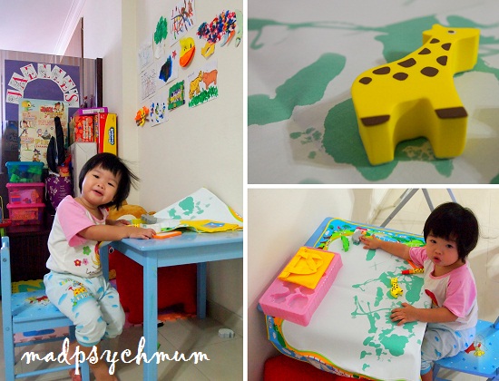 This is done with the help of a set of table and chairs handed down to her from her cousins, some alphabet mats and a big soft toy.